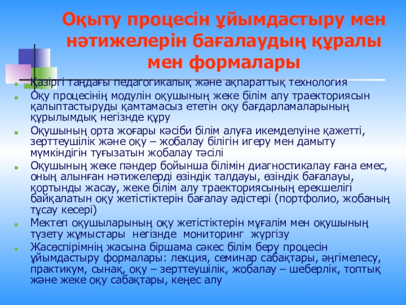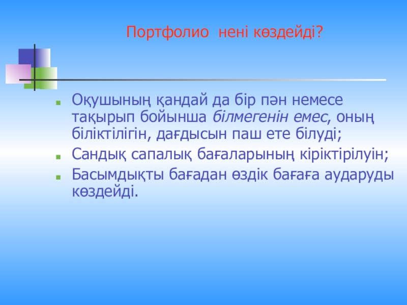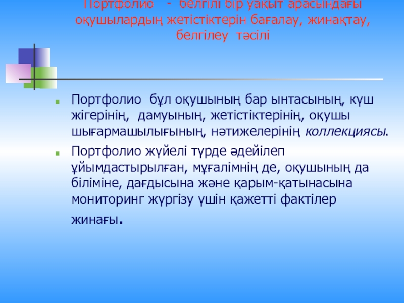 Портфолио жүйелі түрде әдейілеп ұйымдастырылған, мұғалімнің де, оқушының да біліміне, дағдысына және қарым-қатынасына мониторинг жүргізу үшін қажетті фактілер жинағы.