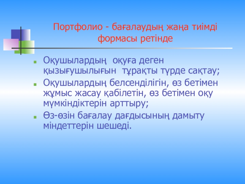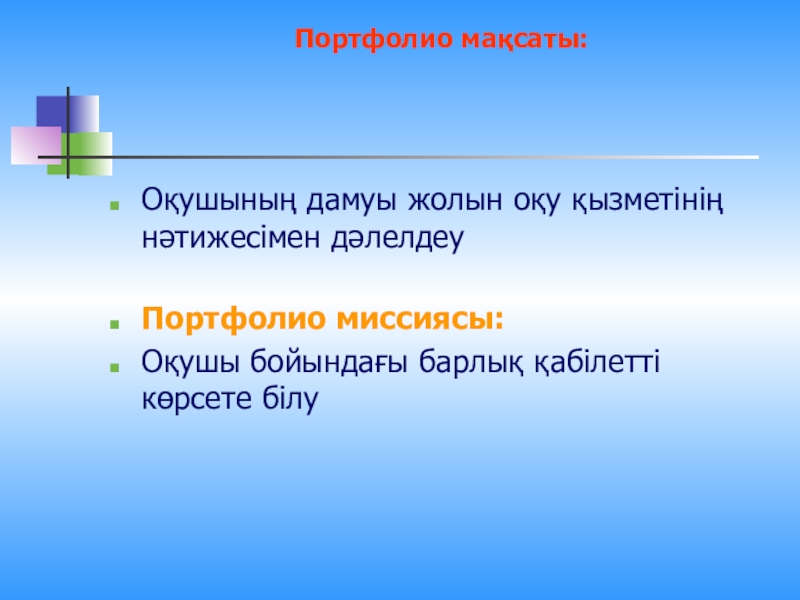 Портфолио бұл оқушының бар ынтасының, күш жігерінің, дамуының, жетістіктерінің, оқушы шығармашылығының, нәтижелерінің коллекциясы.