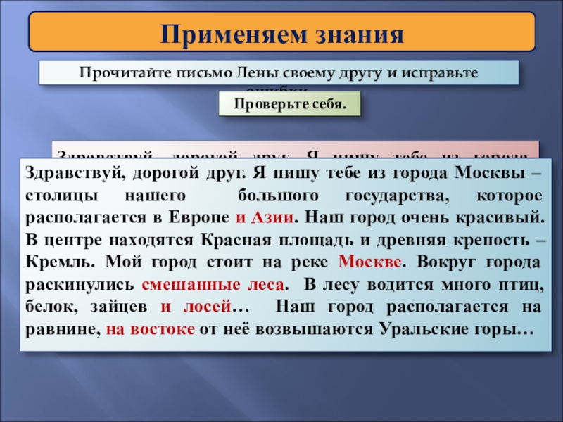 Здравствуй, дорогой друг. Я пишу тебе из города Москвы – столицы нашего большого государства, которое располагается в Европе и Азии. Наш город очень красивый. В центре находятся Красная площадь и древняя крепость – Кремль. Мой город стоит на реке Москве. Вокруг города раскинулись смешанные леса. В лесу водится много птиц, белок, зайцев и лосей… Наш город располагается на равнине, на востоке от неё возвышаются Уральские горы…