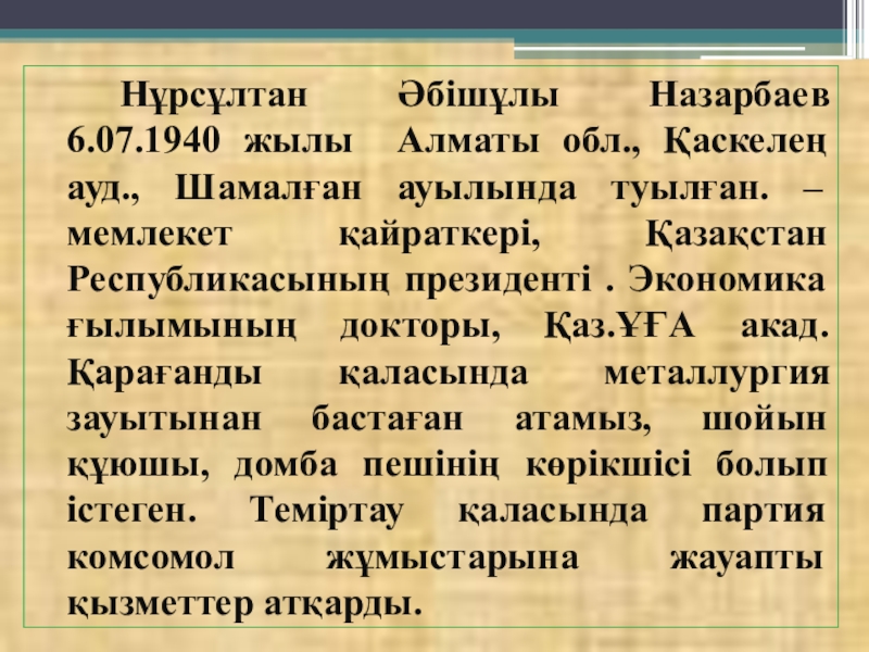 Слайд 3 Нұрсұлтан Әбішұлы Назарбаев 6.07.1940 жылы Алматы обл., Қаскелең ауд., Шамалған ауылында