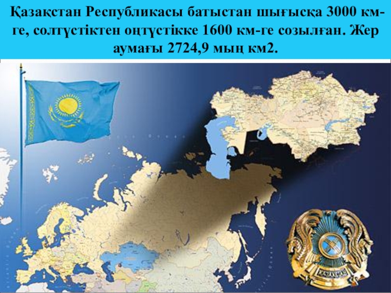 Слайд 7 Қазақстан Республикасы батыстан шығысқа 3000 км-ге, солтүстіктен оңтүстікке 1600 км-ге