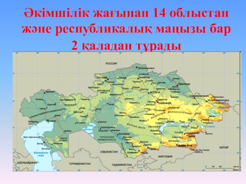 Слайд 11Әкiмшілік жағынан 14 облыстан және республикалық маңызы бар 2 қаладан тұрады