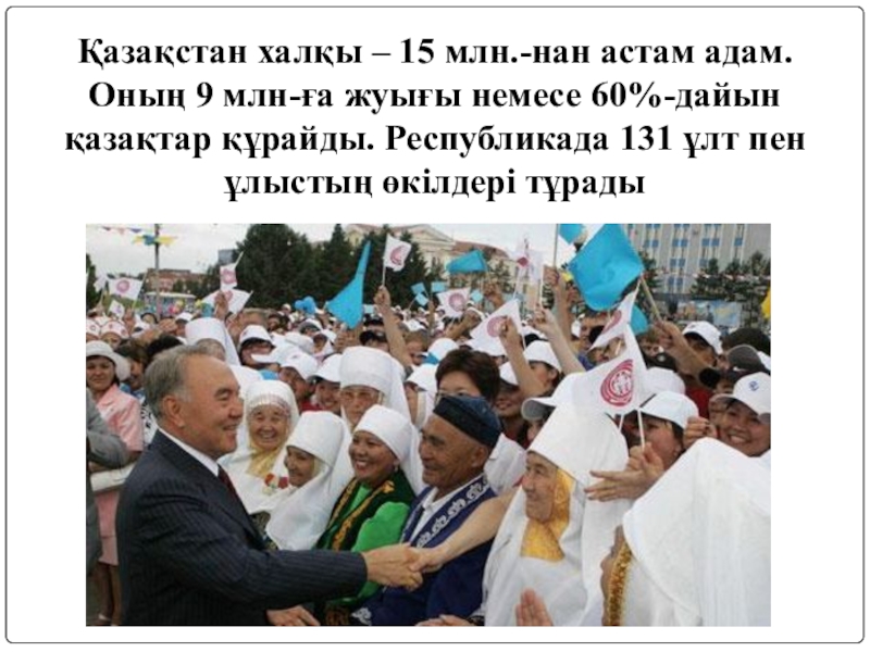 Қазақстан халқы – 15 млн.-нан астам адам. Оның 9 млн-ға жуығы немесе 60%-дайын қазақтар құрайды. Республикада 131