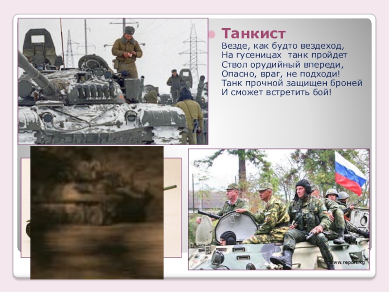 Танкист Везде, как будто вездеход, На гусеницах  танк пройдет Ствол орудийный впереди, Опасно, враг, не подходи! Танк