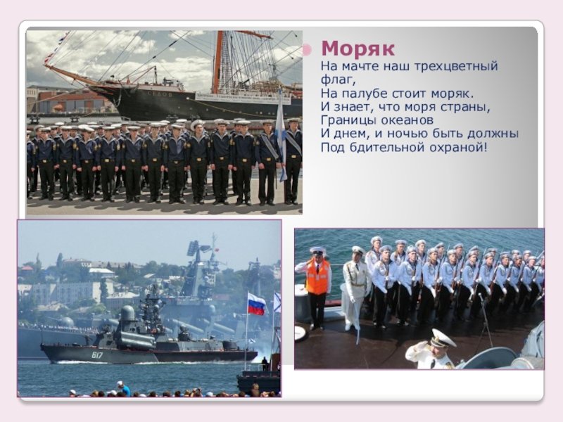Слайд 8Моряк На мачте наш трехцветный флаг, На палубе стоит моряк. И знает, что моря
