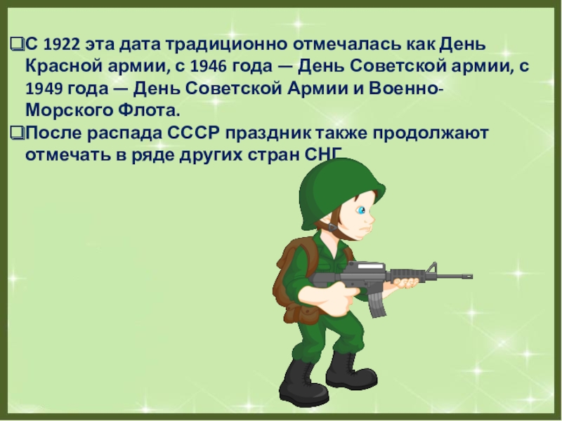 Слайд 3С 1922 эта дата традиционно отмечалась как День Красной армии, с 1946