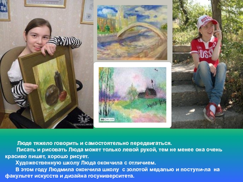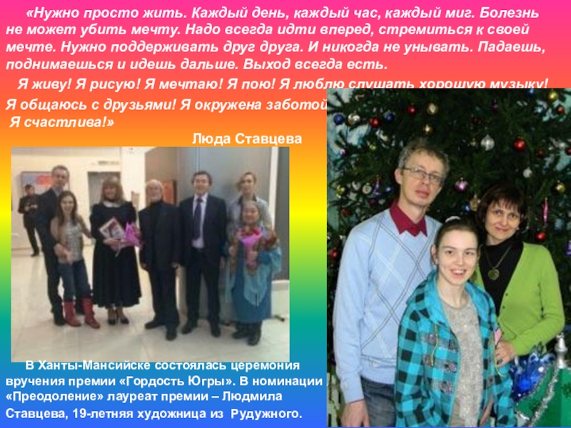 В Ханты-Мансийске состоялась церемония вручения премии «Гордость Югры». В номинации «Преодоление» лауреат премии – Людмила Ставцева, 19-летняя художница из Рудужного.