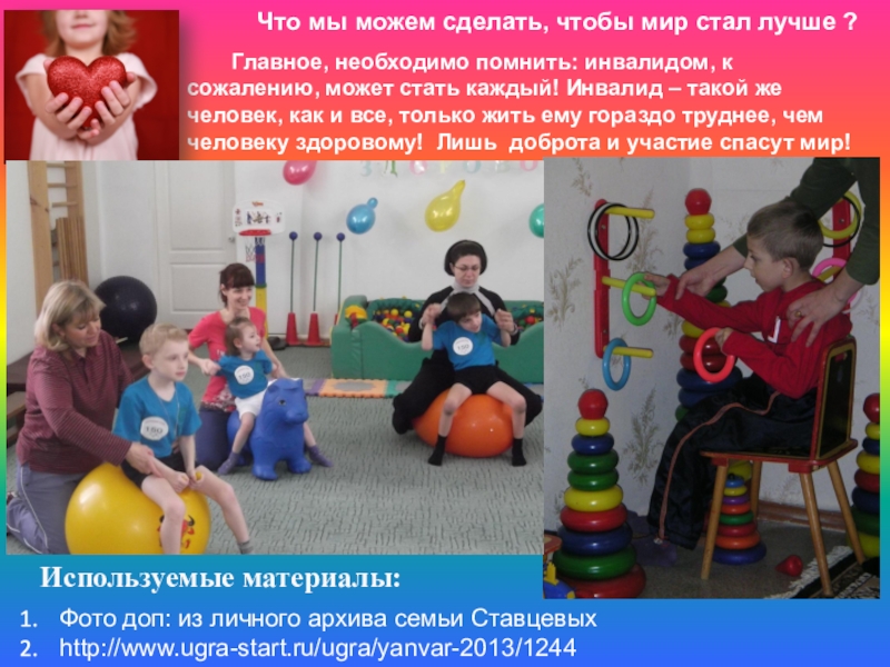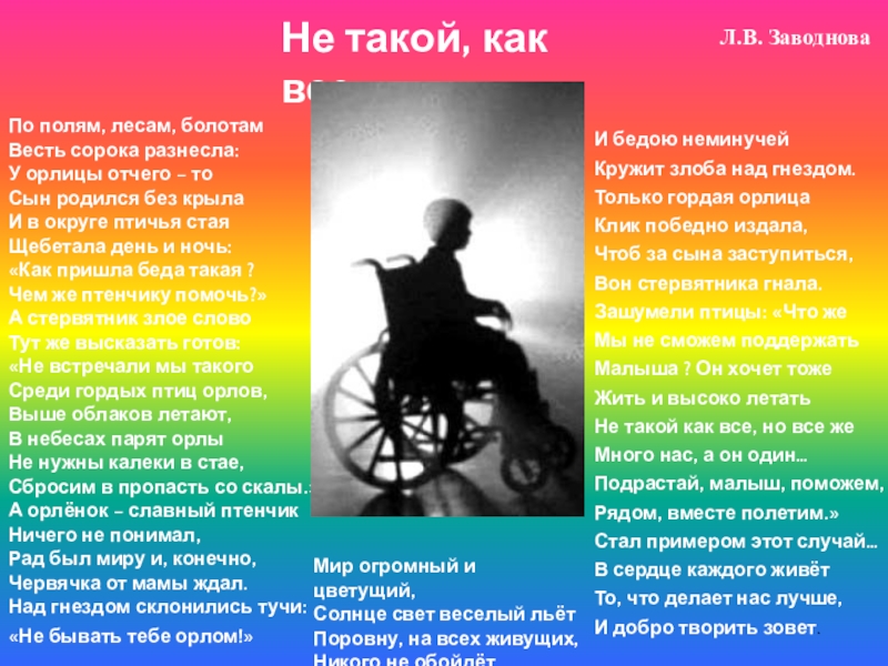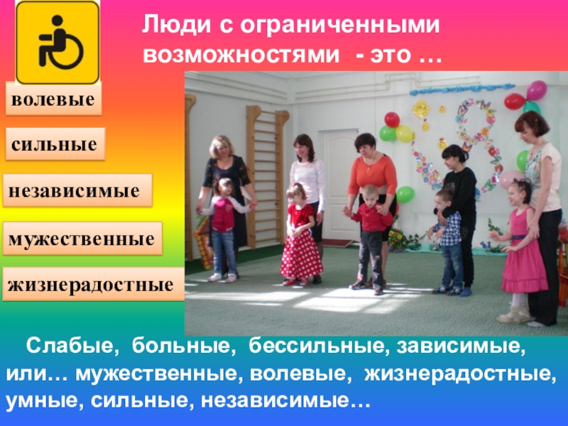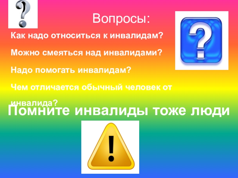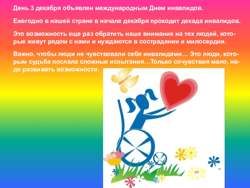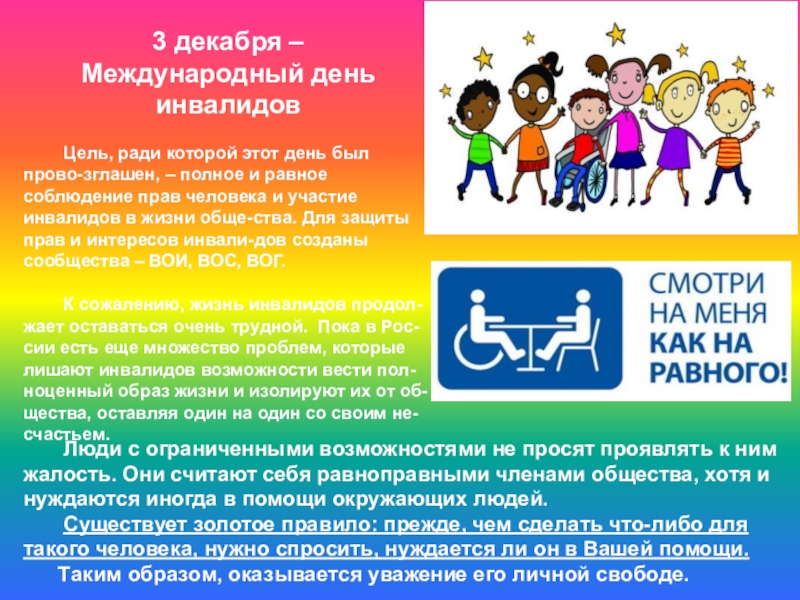 Люди с ограниченными возможностями не просят проявлять к ним жалость. Они считают себя равноправными членами общества, хотя и нуждаются иногда в помощи окружающих людей.