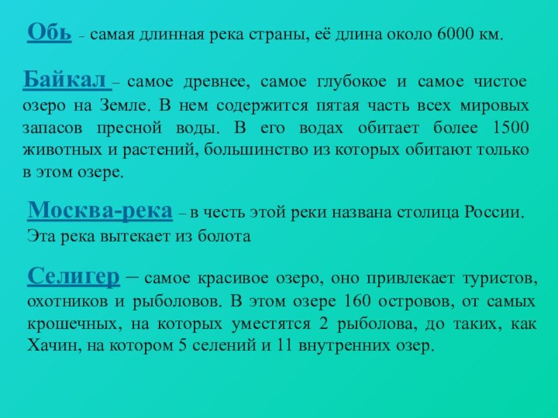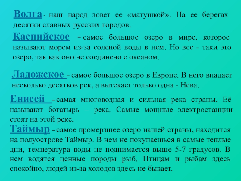 Енисей – самая многоводная и сильная река страны. Её называют богатырь – река. Самые мощные электростанции стоят на этой реке.