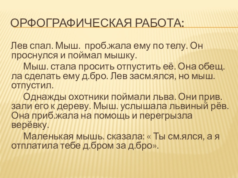 Орфографическая работа:  Лев спал. Мыш. проб.жала ему по телу. Он проснулся и поймал мышку.