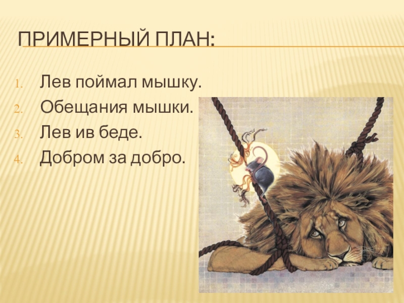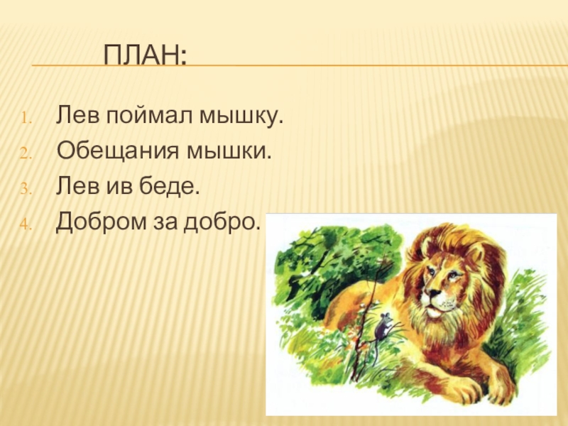 План:Лев поймал мышку.Обещания мышки.Лев ив беде.Добром за добро.