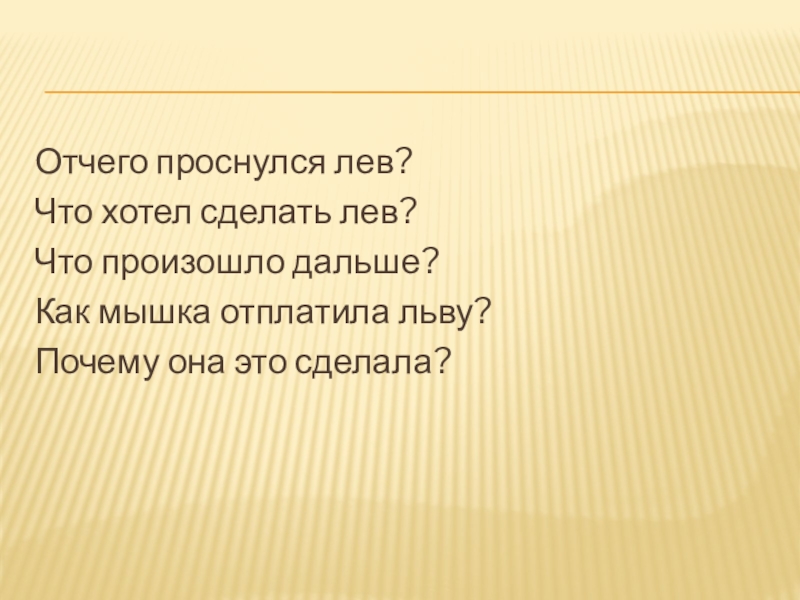 Отчего проснулся лев?Что хотел сделать лев?Что произошло дальше?Как мышка отплатила льву?Почему она это сделала?