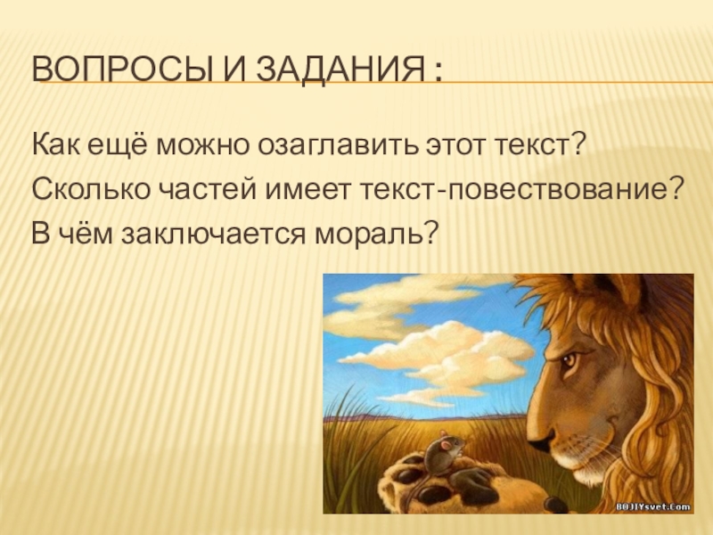 Вопросы и задания :Как ещё можно озаглавить этот текст?Сколько частей имеет текст-повествование?В чём заключается мораль?