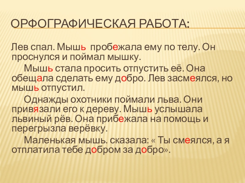 Орфографическая работа:  Лев спал. Мышь пробежала ему по телу. Он проснулся и поймал мышку.