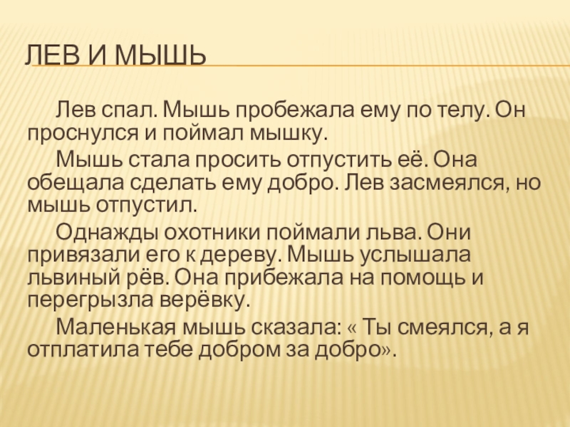 Лев и мышь Лев спал. Мышь пробежала ему по телу. Он проснулся и поймал мышку. Мышь стала просить отпустить её. Она обещала сделать ему добро. Лев засмеялся, но