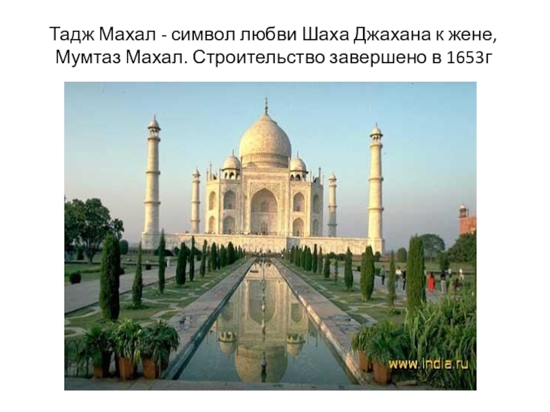 Слайд 5Тадж Махал - символ любви Шаха Джахана к жене, Мумтаз Махал.