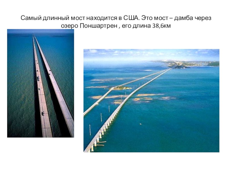 Самый длинный мост находится в США. Это мост – дамба через озеро Поншартрен , его длина 38,6км