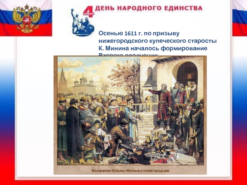 Слайд 8Осенью 1611 г. по призыву нижегородского купеческого старосты К. Минина началось формирование