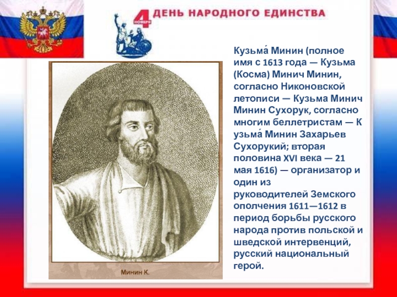 Слайд 6Кузьма́ Минин (полное имя с 1613 года — Кузьма (Косма) Минич Минин, согласно Никоновской