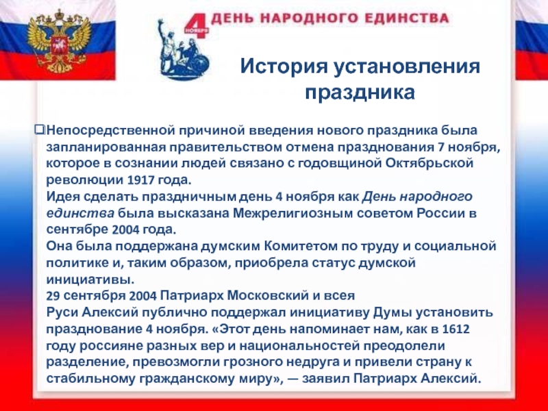 29 сентября 2004 Патриарх Московский и всея Руси Алексий публично поддержал инициативу Думы установить празднование 4 ноября. «Этот день напоминает нам, как в 1612 году россияне разных вер и национальностей преодолели разделение, превозмогли грозного недруга и привели страну к стабильному гражданскому миру», — заявил Патриарх Алексий.