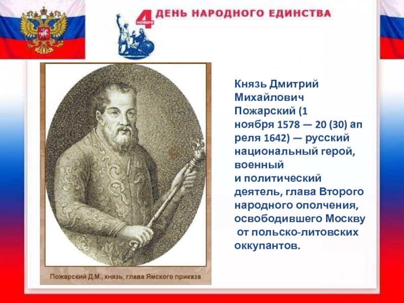 Слайд 7Князь Дмитрий Михайлович Пожарский (1 ноября 1578 — 20 (30) апреля 1642) — русский национальный герой, военный и политический деятель, глава Второго