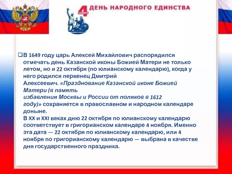 Слайд 3В 1649 году царь Алексей Михайлович распорядился отмечать день Казанской иконы Божией Матери не только летом,