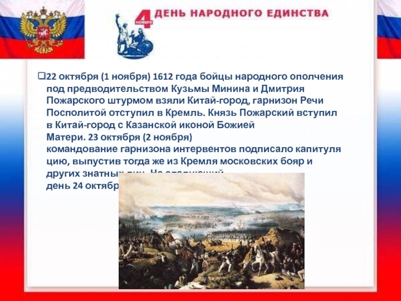 Слайд 222 октября (1 ноября) 1612 года бойцы народного ополчения под предводительством Кузьмы Минина и Дмитрия Пожарского штурмом взяли Китай-город, гарнизон