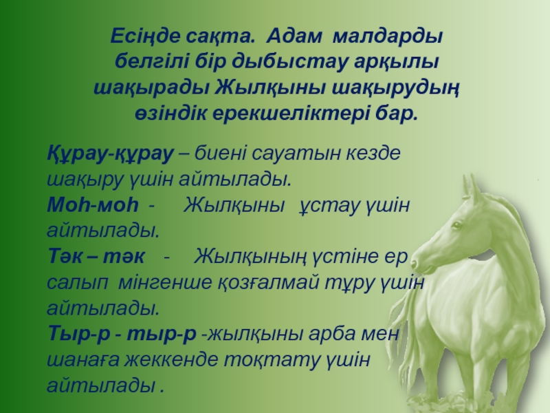Есіңде сақта. Адам малдарды белгілі бір дыбыстау арқылы шақырады Жылқыны шақырудың өзіндік ерекшеліктері бар.