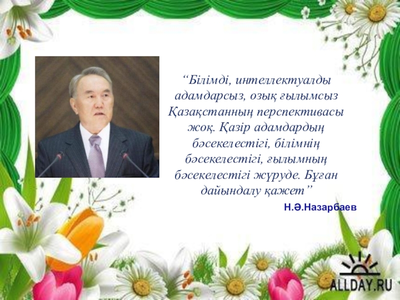 “Білімді, интеллектуалды адамдарсыз, озық ғылымсыз Қазақстанның перспективасы жоқ. Қазір адамдардың бәсекелестігі, білімнің бәсекелестігі, ғылымның бәсекелестігі жүруде. Бұған дайындалу қажет”