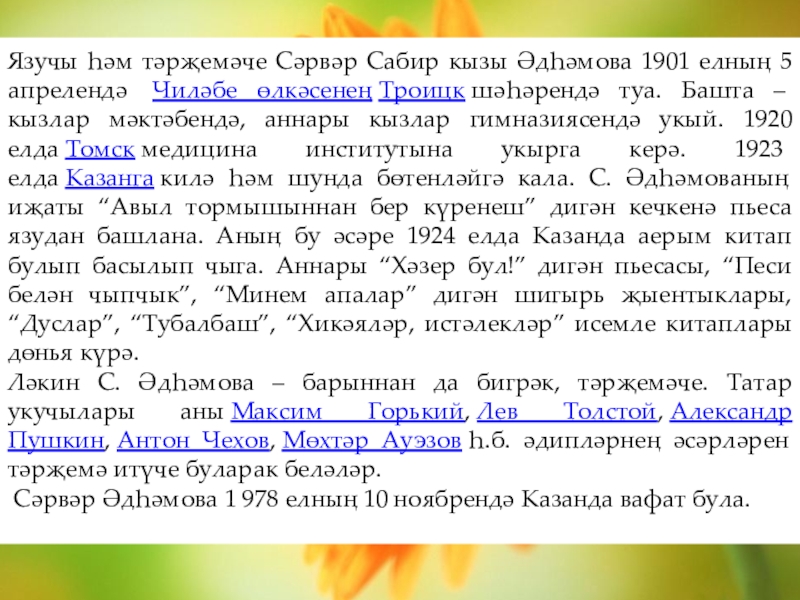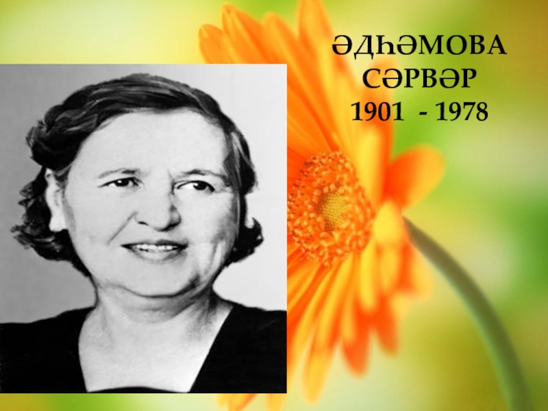 Слайд 4Язучы һәм тәрҗемәче Сәрвәр Сабир кызы Әдһәмова 1901 елның 5 апрелендә