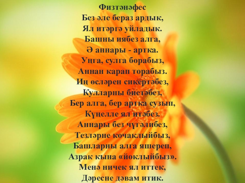 Слайд 6Физтәнәфес Без әле бераз ардык, Ял итәргә уйладык. Башны иябез алга, Ә аннары - артка. Уңга,
