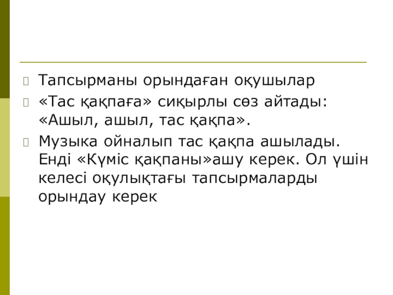 Тапсырманы орындаған оқушылар «Тас қақпаға» сиқырлы сөз айтады: «Ашыл, ашыл, тас қақпа». Музыка ойналып тас қақпа ашылады.