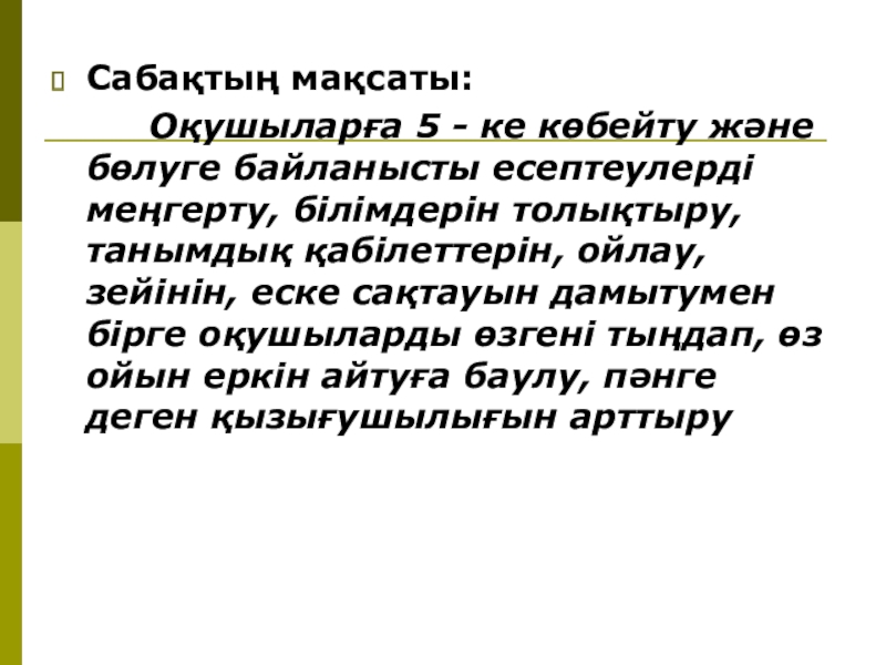 Сабақтың мақсаты: Оқушыларға 5 - ке көбейту және бөлуге байланысты есептеулерді меңгерту, білімдерін толықтыру, танымдық қабілеттерін, ойлау, зейінін, еске сақтауын дамытумен бірге оқушыларды өзгені тыңдап, өз ойын еркін айтуға баулу, пәнге деген
