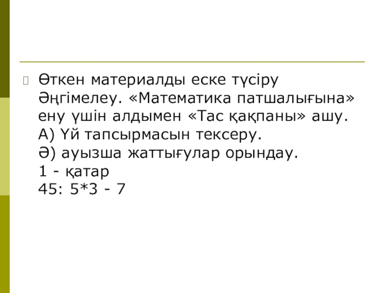 Үй тапсырмасын тексеру. Ә) ауызша жаттығулар орындау. 1 - қатар 45: 5*3 - 7