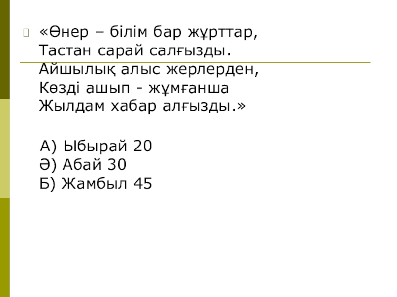 «Ең бірінші бақытым - халқым менің, Соған берем ойымның алтын кенін. Ол бар болса, мен бармын, қор болмаймын Қымбатырақ алтыннан нарқым менің». А) М: Мақатаев 47 Ә) Қ. Мырзалиев 56 Б) С. Сейфуллин 23 5 ↓ асыл іс қару дұшпан Үш түс: сары, қызыл, жасыл бағдаршамның түстері 3. Қайталау сабағы.