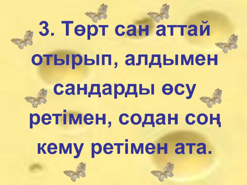 3. Төрт сан аттай отырып, алдымен сандарды өсу ретімен, содан соң кему ретімен ата.