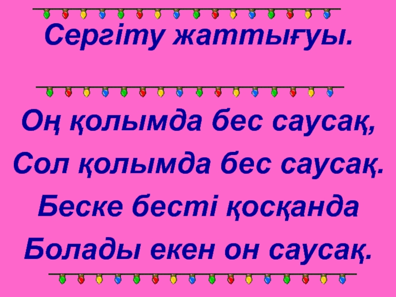 Сергіту жаттығуы.Оң қолымда бес саусақ,Сол қолымда бес саусақ.Беске бесті қосқандаБолады екен он саусақ.