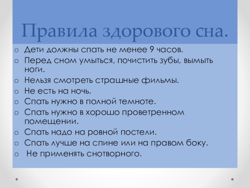 Правила здорового сна.Дети должны спать не менее 9 часов.Перед сном умыться, почистить зубы, вымыть ноги.Нельзя смотреть страшные