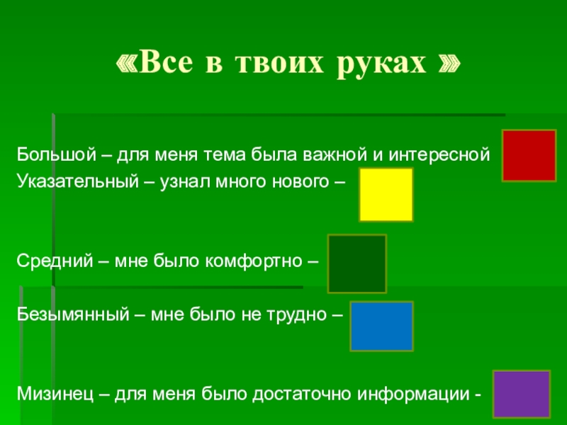 «Все в твоих руках »Большой – для меня тема была важной и интереснойУказательный – узнал много нового