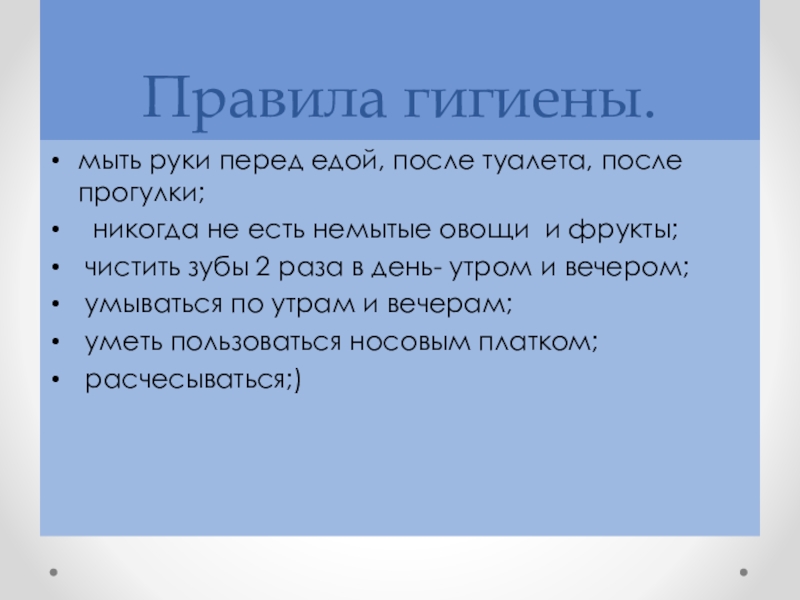 Правила гигиены. мыть руки перед едой, после туалета, после прогулки; никогда не есть немытые овощи и фрукты;