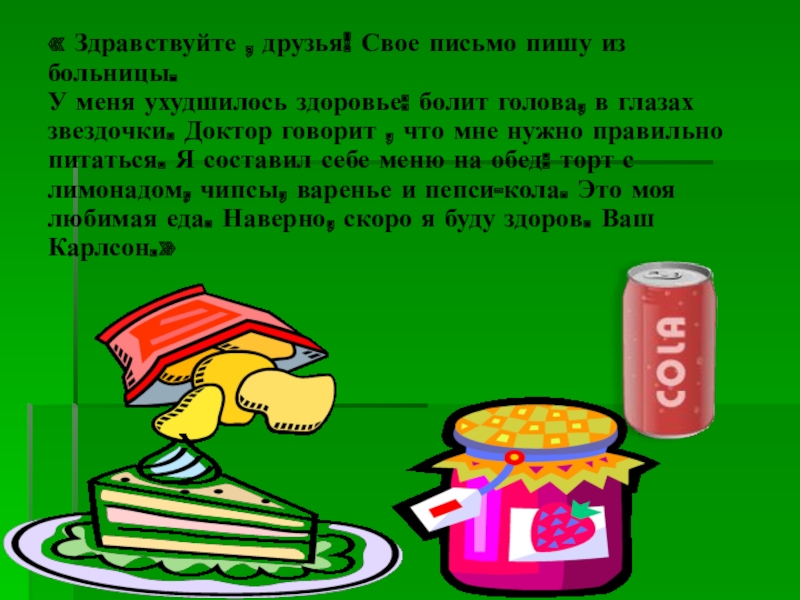 здоровье: болит голова, в глазах звездочки. Доктор говорит , что мне нужно правильно питаться. Я составил себе меню на обед: торт с лимонадом, чипсы, варенье и пепси-кола. Это моя любимая еда. Наверно, скоро я буду здоров. Ваш Карлсон.»