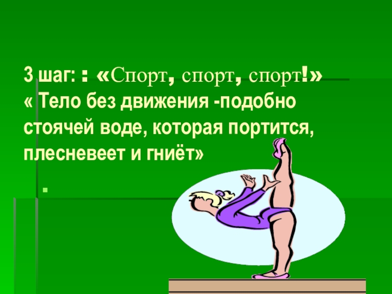 Слайд 6 3 шаг: : «Спорт, спорт, спорт!» « Тело без движения -подобно