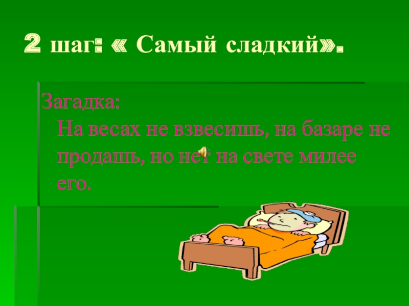 2 шаг: « Самый сладкий». Загадка: На весах не взвесишь, на базаре не продашь, но нет на