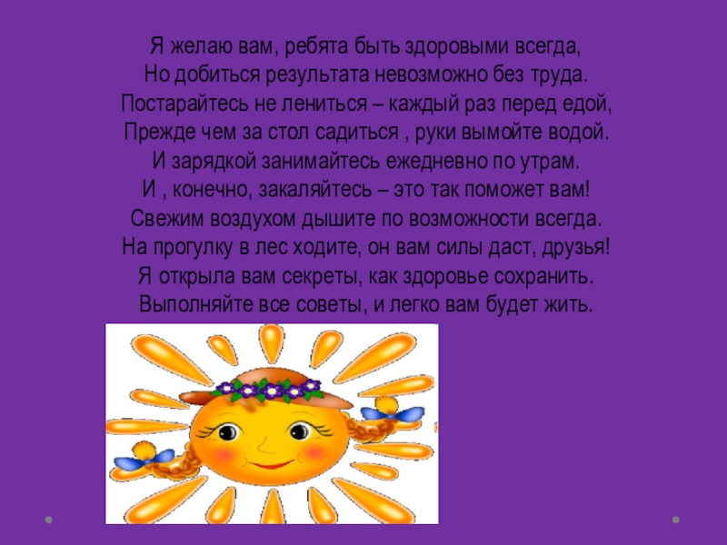 Я желаю вам, ребята быть здоровыми всегда,Но добиться результата невозможно без труда.Постарайтесь не лениться – каждый раз