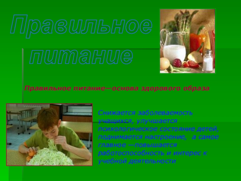 Правильное питаниеПравильное питание—основа здорового образа Снижается заболеваемость учащихся, улучшается психологическое состояние детей, поднимается настроение,  а самое главное