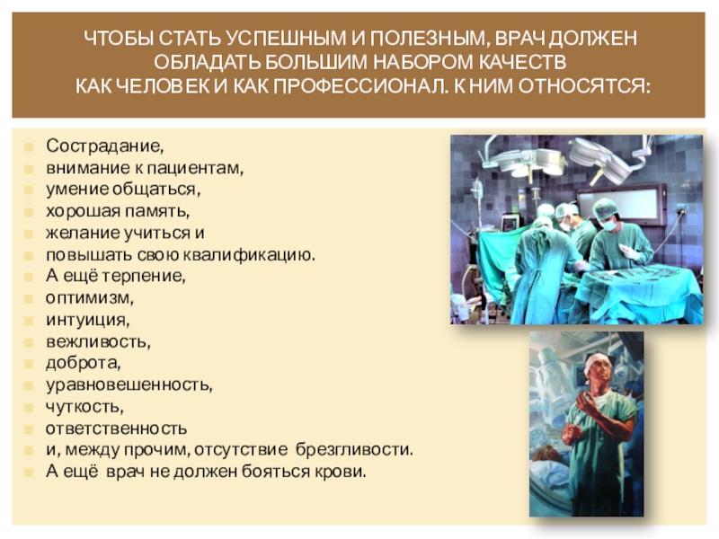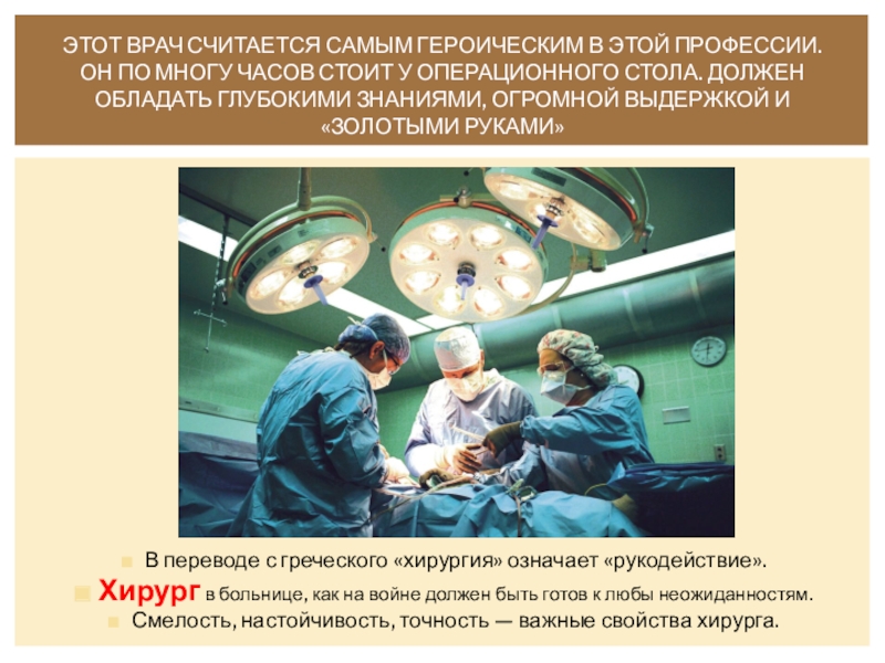 Этот врач считается самым героическим в этой профессии. Он по многу часов стоит у операционного стола. должен обладать глубокими знаниями, огромной выдержкой и «золотыми руками»
