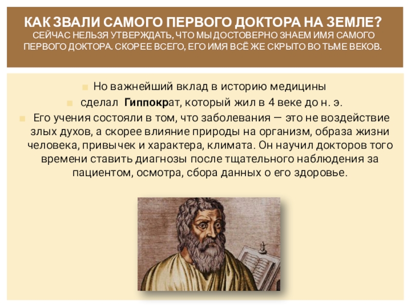 сейчас нельзя утверждать, что мы достоверно знаем имя самого первого доктора. Скорее всего, его имя всё же скрыто во тьме веков.