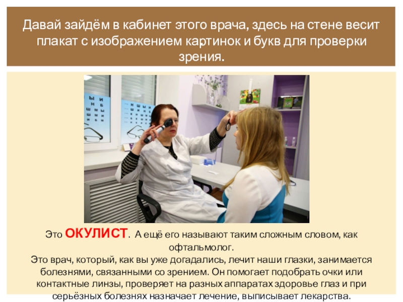 Это врач, который, как вы уже догадались, лечит наши глазки, занимается болезнями, связанными со зрением. Он помогает подобрать очки или контактные линзы, проверяет на разных аппаратах здоровье глаз и при серьёзных болезнях назначает лечение, выписывает лекарства.