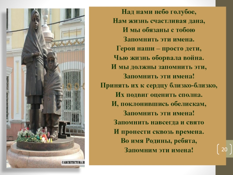 Над нами небо голубое,Нам жизнь счастливая дана,И мы обязаны с тобоюЗапомнить эти имена.Герои наши – просто дети,Чью