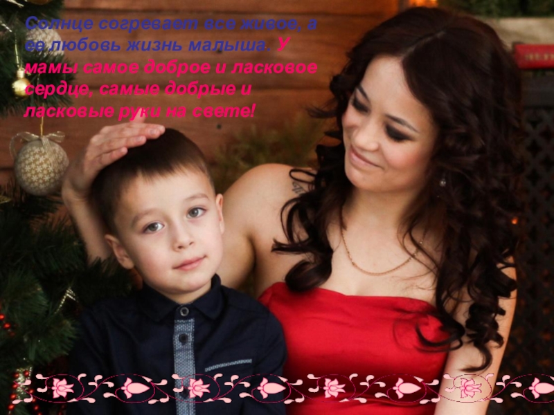Солнце согревает все живое, а ее любовь жизнь малыша. У мамы самое доброе и ласковое сердце, самые добрые и ласковые руки на свете!